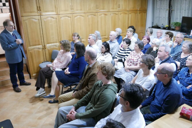 A közös imádság után köszöntötte és bemutatta az előadót, Dr. Békési Sándort. „Szentek protestáns szemmel” – szólt a meghívó, amelynek lehetőségét Békési professzor készülő rajzfilmsorozata adta.