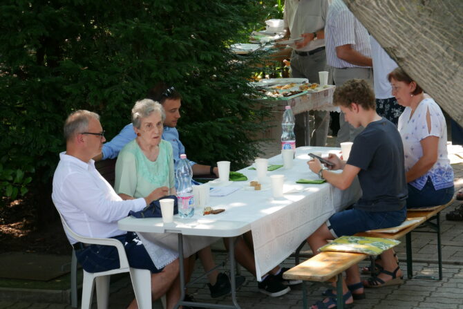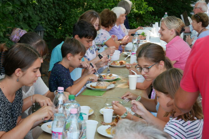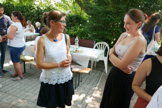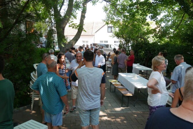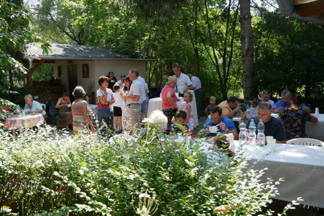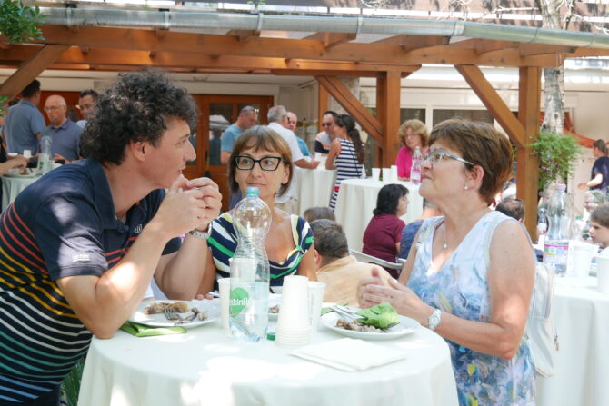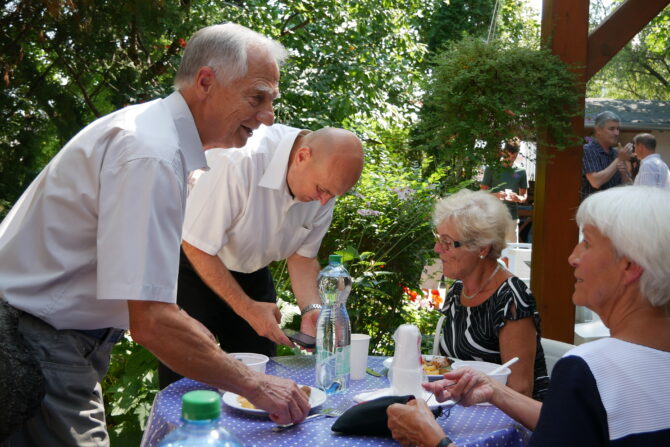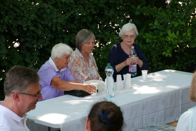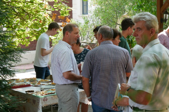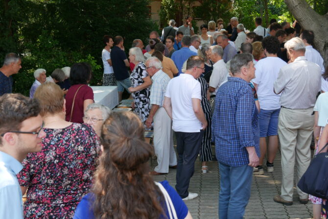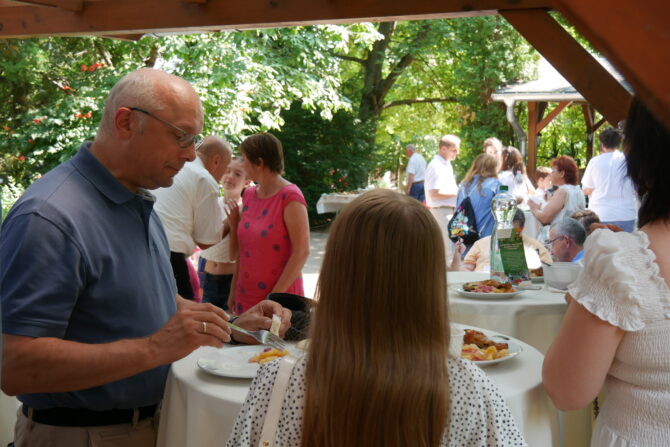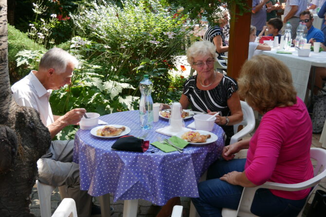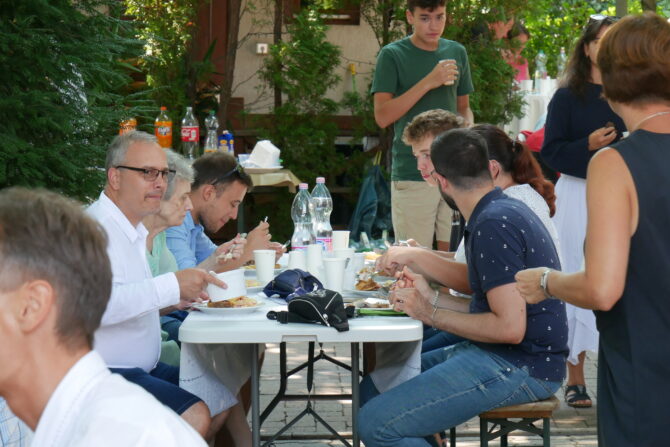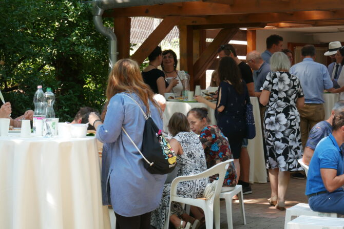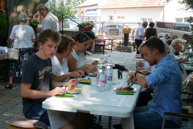 Az istentisztelet után templomunk udvarán egy szerény szeretetvendégségre, állófogadásra került sor. Az asztalok körül beszélgetések, ismerkedés, történetek felelevenítése zajlott baráti, testvéri közösségben. Megtisztelte jelenlétével az összejövetelt Balatonalmádi polgármestere, Fabó Péter is, aki a város augusztus 20-i ünnepsége után fontosnak tartotta, hogy részt vegyen a település élő, szentlelkes közösségének az ünnepén.