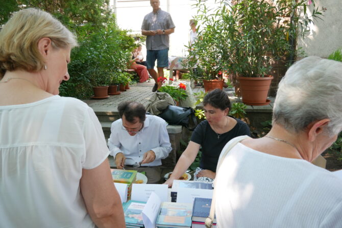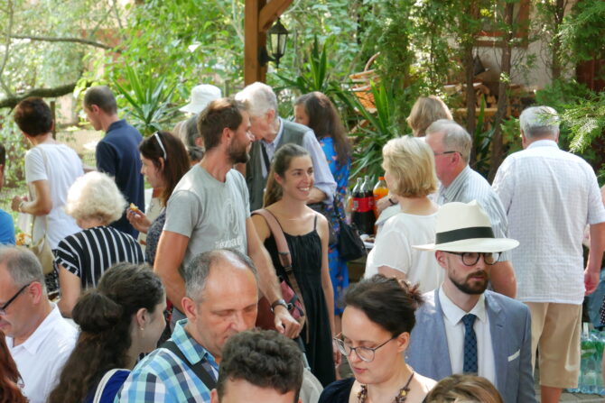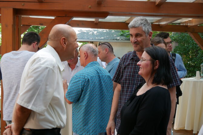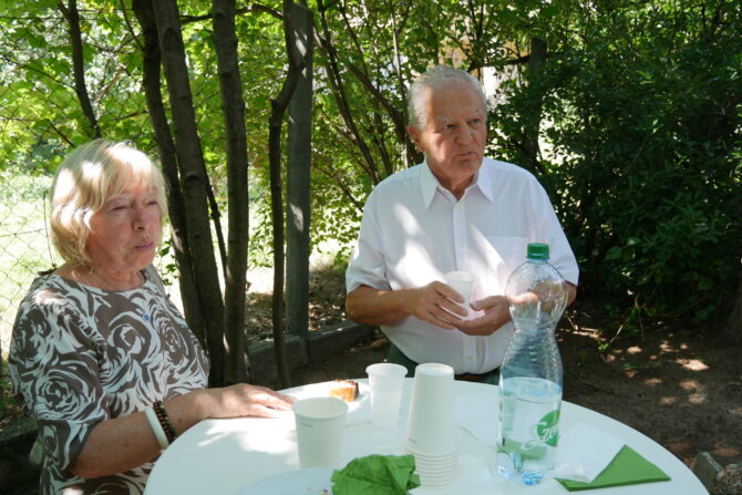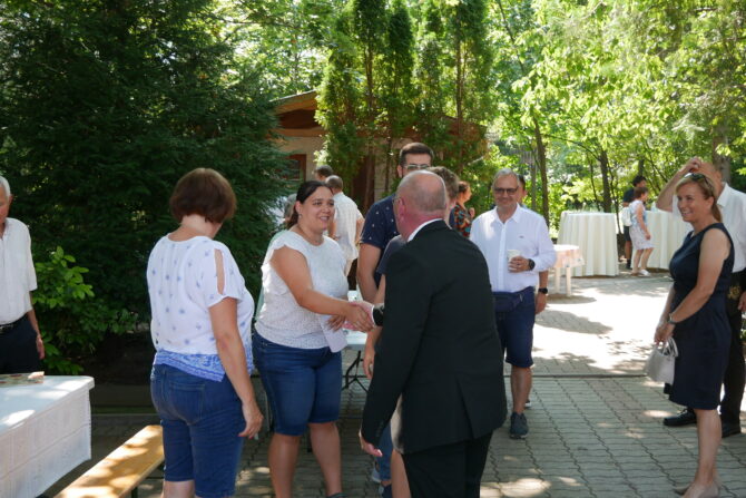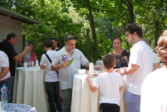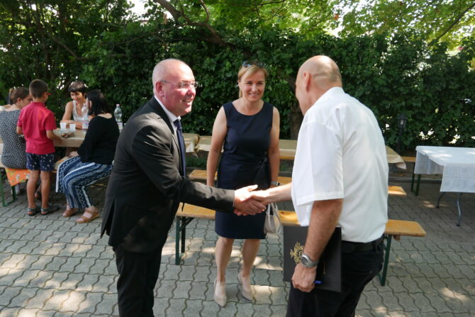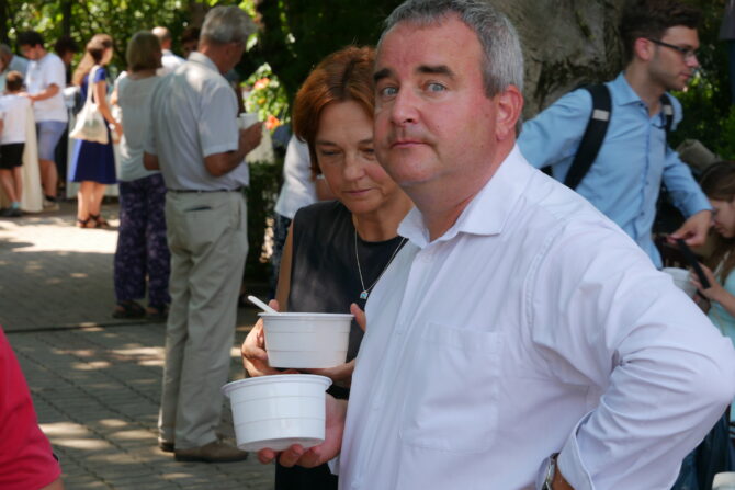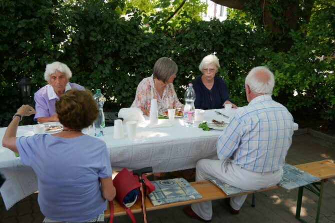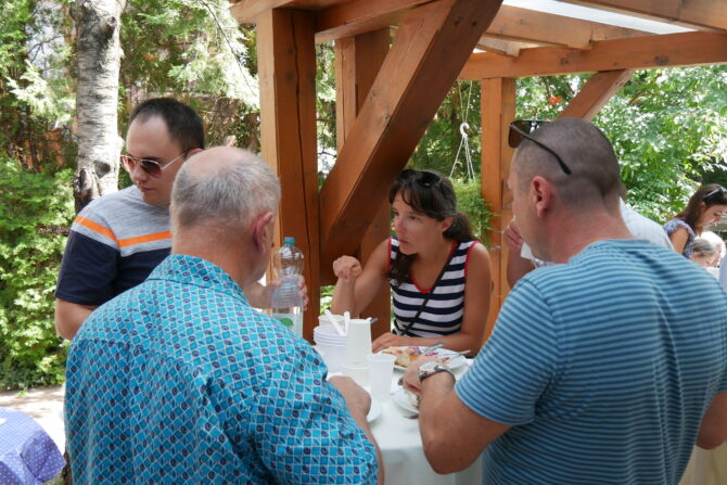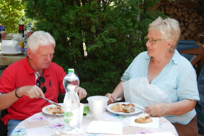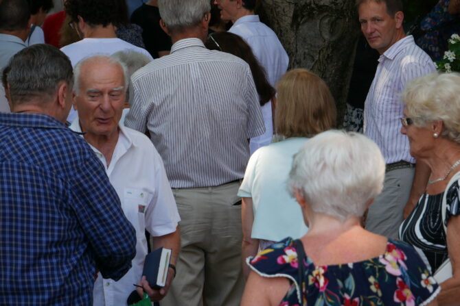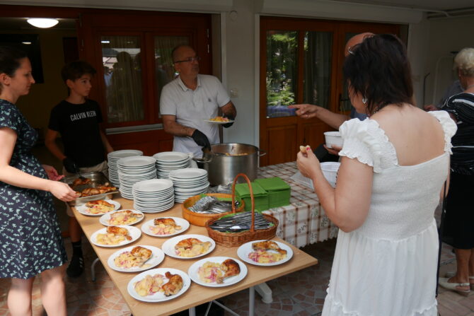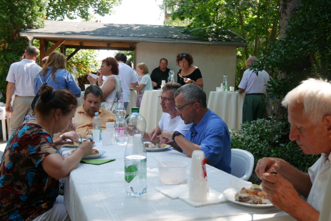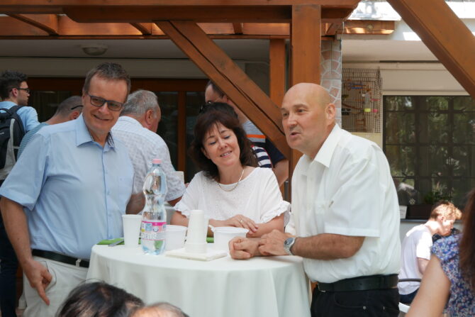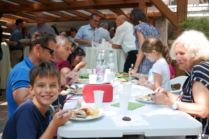 Az istentisztelet után templomunk udvarán egy szerény szeretetvendégségre, állófogadásra került sor. Az asztalok körül beszélgetések, ismerkedés, történetek felelevenítése zajlott baráti, testvéri közösségben. Megtisztelte jelenlétével az összejövetelt Balatonalmádi polgármestere, Fabó Péter is, aki a város augusztus 20-i ünnepsége után fontosnak tartotta, hogy részt vegyen a település élő, szentlelkes közösségének az ünnepén.
