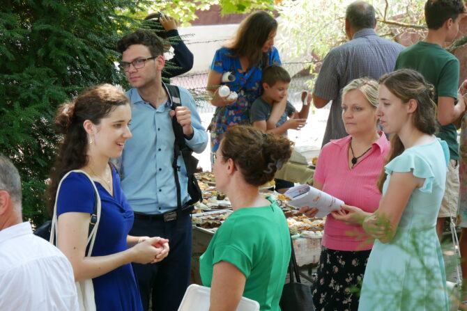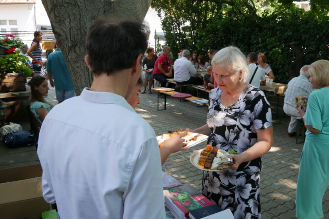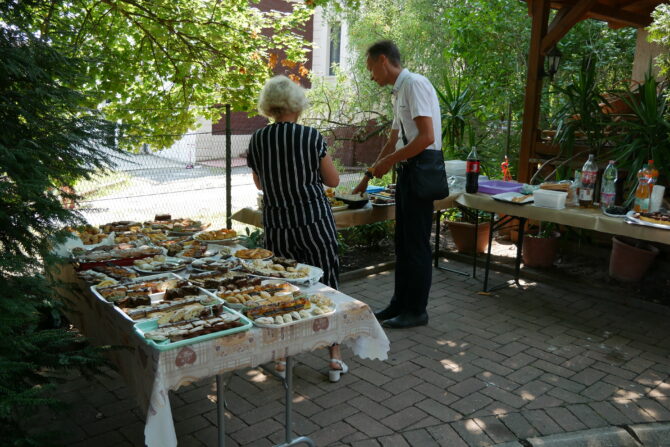 A többhetes szervezés után az utolsó simítások vasárnap reggel korán kezdődtek. Gyülekezetünk tagjai elkészítették a templomudvart a vendégek fogadására. Helyükre kerültek a padok és az asztalok. Két asztalt is megtöltött a sütemények garmadája, amit a testvérek sütöttek, ajánlottak fel erre az alkalomra.