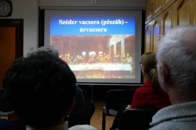 Az előadás második részében a Pészách legfontosabb elemének, a széder vacsorának a részletes ismertetése hangzott el, az, ahogyan azt Jézus a tanítványaival az utolsó vacsora alatt elfogyasztotta. Ez az Isten dicsőségének szentelt esemény szigorú rend szerint zajlott, és zsidó közösségekben még ma is nagyjából így megy végbe. Minden fogásnak jelentősége, jelentése van, amelyekhez előírások, mozdulatok és Isten szabadító történeteinek felelevenítése kapcsolódik. Így tudhattuk meg, hogy ezeken az estéken nem székeken ültek (fekve vagy oldalra dőlve fogyasztják el a vacsorát), hogy milyen eszközöket vettek igénybe – ezekből hozott is magával az előadó – mikor mit használtak, mit ettek és azok milyen jelentéstartalommal bírnak, kinek milyen szerepe van a vacsora alatt.